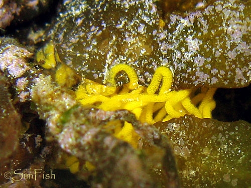 在約一米距離外的藻叢中,有一黃色的海兔卵帶,不知是那種海兔的產物。