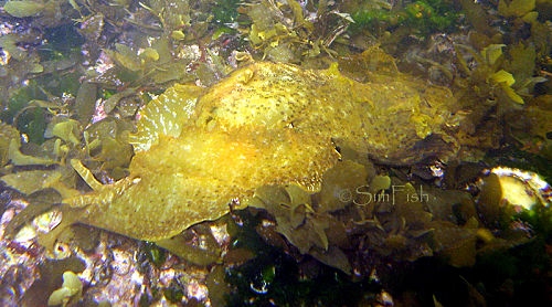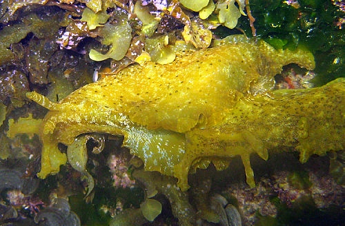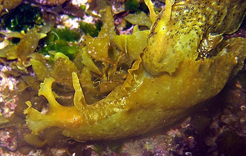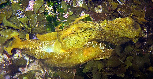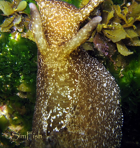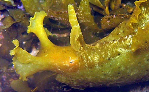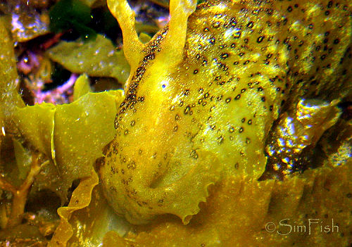 黃色身體上,可見有假眼斑點散佈身上,那便應該是眼斑海兔(Aplysia oculifera)。